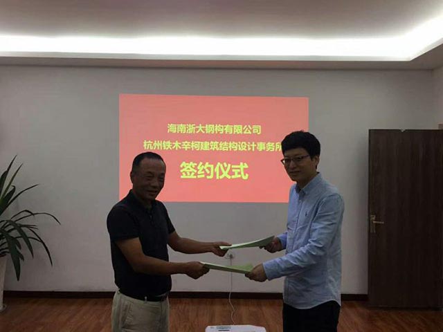 2017年10月21號,海南浙大鋼構有限公司與杭州鐵木辛柯建筑結構設計事務(wù)所就”隱式框架鋼結構住宅體系”專(zhuān)利技術(shù)的應用合作在杭州成功簽約。