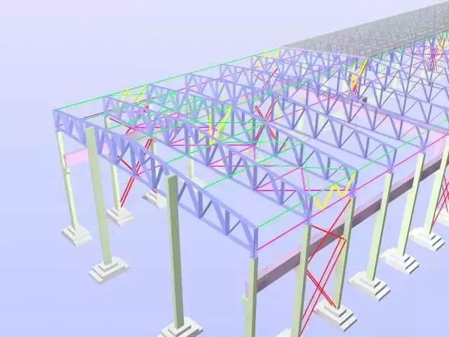 5、支撐和拉條部分:一般材料都是圓鋼,且通常情況下按圖紙計算實(shí)際長(cháng)度,同樣要注意相對應的節點(diǎn)(連接板和螺栓)。